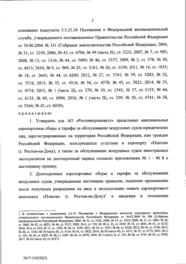 "ОБ УТВЕРЖДЕНИИ ТАРИФОВ (СБОРОВ) НА УСЛУГИ В АЭРОПОРТУ "ПЛАТОВ" (Г. РОСТОВ-НА-ДОНУ), ОКАЗЫВАЕМЫЕ АО "РОСТОВАЭРОИНВЕСТ"