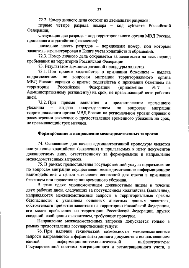 "ОБ УТВЕРЖДЕНИИ АДМИНИСТРАТИВНОГО РЕГЛАМЕНТА МИНИСТЕРСТВА ВНУТРЕННИХ ДЕЛ РОССИЙСКОЙ ФЕДЕРАЦИИ ПО ПРЕДОСТАВЛЕНИЮ ГОСУДАРСТВЕННОЙ УСЛУГИ ПО РАССМОТРЕНИЮ ХОДАТАЙСТВ О ПРИЗНАНИИ БЕЖЕНЦЕМ НА ТЕРРИТОРИИ РОССИЙСКОЙ ФЕДЕРАЦИИ И ЗАЯВЛЕНИЙ О ПРЕДОСТАВЛЕНИИ ВРЕМЕННОГО УБЕЖИЩА НА ТЕРРИТОРИИ РОССИЙСКОЙ ФЕДЕРАЦИИ"