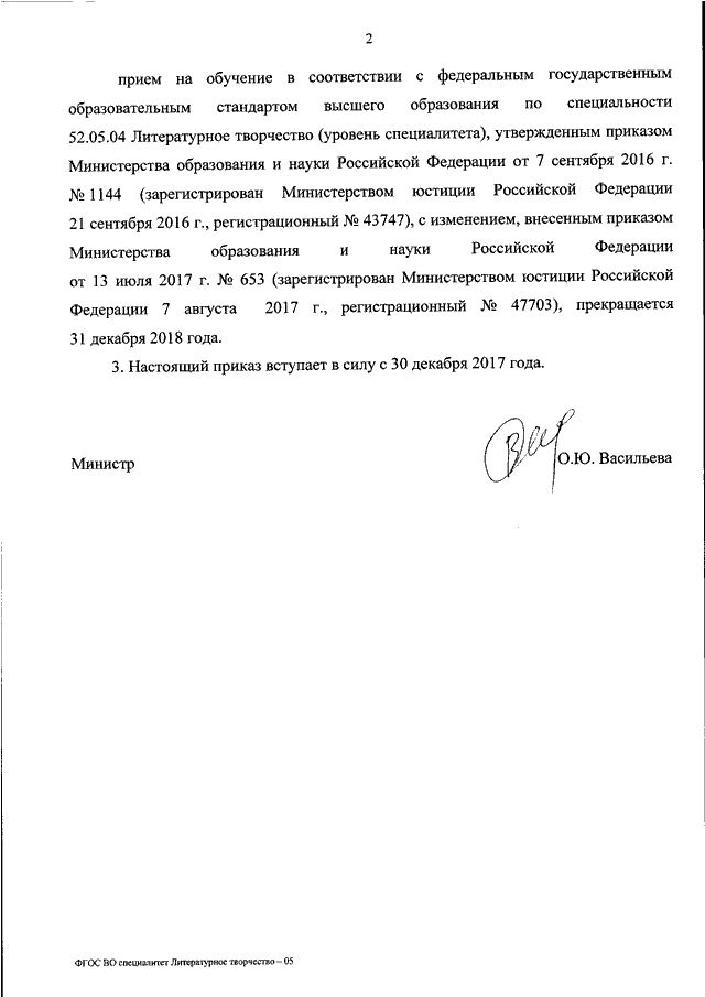 "ОБ УТВЕРЖДЕНИИ ФЕДЕРАЛЬНОГО ГОСУДАРСТВЕННОГО ОБРАЗОВАТЕЛЬНОГО СТАНДАРТА ВЫСШЕГО ОБРАЗОВАНИЯ - СПЕЦИАЛИТЕТ ПО СПЕЦИАЛЬНОСТИ 52.05.04 ЛИТЕРАТУРНОЕ ТВОРЧЕСТВО"