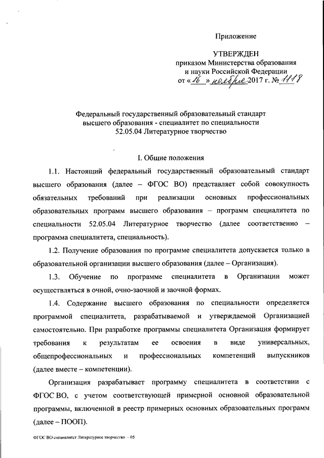 "ОБ УТВЕРЖДЕНИИ ФЕДЕРАЛЬНОГО ГОСУДАРСТВЕННОГО ОБРАЗОВАТЕЛЬНОГО СТАНДАРТА ВЫСШЕГО ОБРАЗОВАНИЯ - СПЕЦИАЛИТЕТ ПО СПЕЦИАЛЬНОСТИ 52.05.04 ЛИТЕРАТУРНОЕ ТВОРЧЕСТВО"