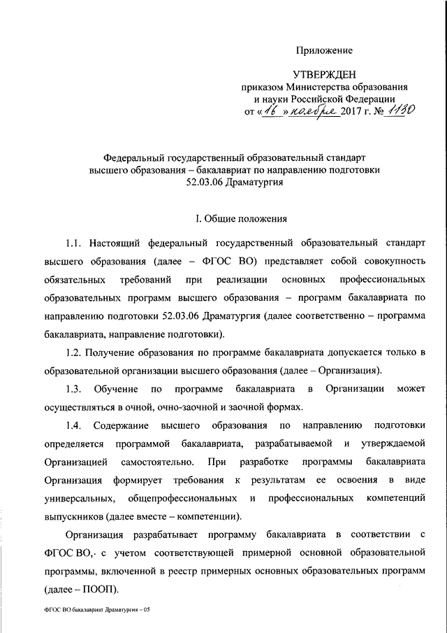 "ОБ УТВЕРЖДЕНИИ ФЕДЕРАЛЬНОГО ГОСУДАРСТВЕННОГО ОБРАЗОВАТЕЛЬНОГО СТАНДАРТА ВЫСШЕГО ОБРАЗОВАНИЯ - БАКАЛАВРИАТ ПО НАПРАВЛЕНИЮ ПОДГОТОВКИ 52.03.06 ДРАМАТУРГИЯ"