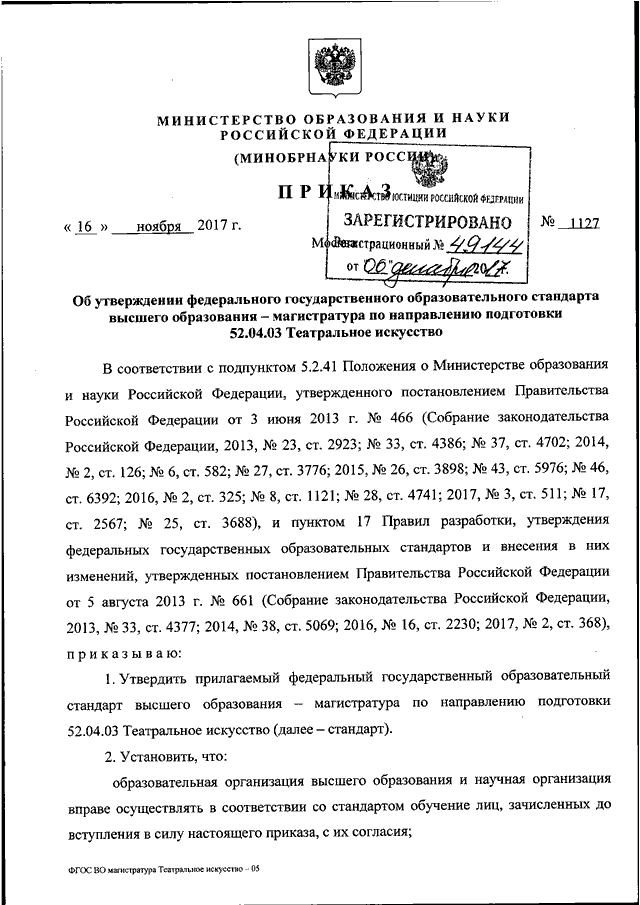 ПРИКАЗ Минобрнауки РФ от 16.11.2017 N 1127