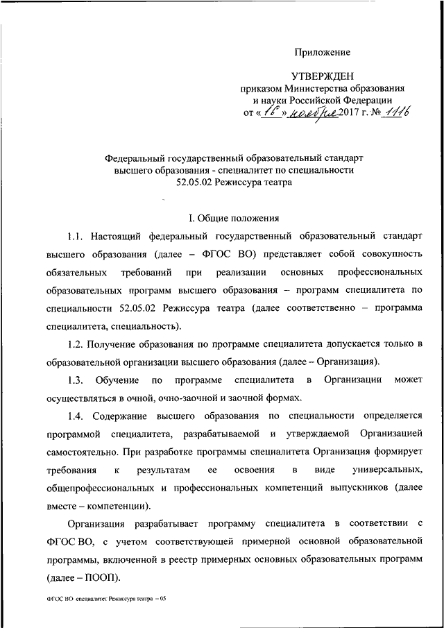 "ОБ УТВЕРЖДЕНИИ ФЕДЕРАЛЬНОГО ГОСУДАРСТВЕННОГО ОБРАЗОВАТЕЛЬНОГО СТАНДАРТА ВЫСШЕГО ОБРАЗОВАНИЯ - СПЕЦИАЛИТЕТ ПО СПЕЦИАЛЬНОСТИ 52.05.02 РЕЖИССУРА ТЕАТРА"
