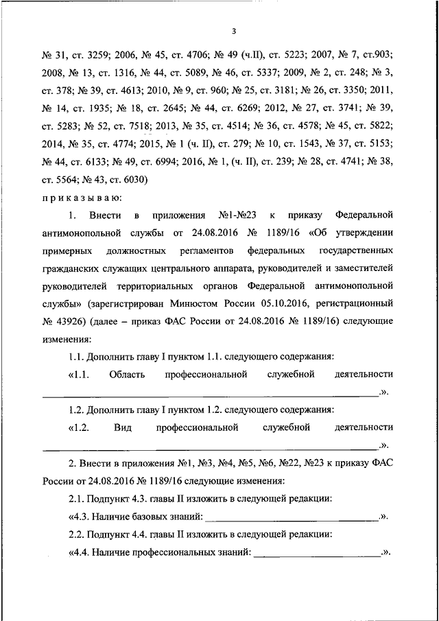 "О ВНЕСЕНИИ ИЗМЕНЕНИЙ В ПРИЛОЖЕНИЯ N 1 - N 23 К ПРИКАЗУ ФЕДЕРАЛЬНОЙ АНТИМОНОПОЛЬНОЙ СЛУЖБЫ ОТ 24.08.2016 N 1189/16 "ОБ УТВЕРЖДЕНИИ ПРИМЕРНЫХ ДОЛЖНОСТНЫХ РЕГЛАМЕНТОВ ФЕДЕРАЛЬНЫХ ГОСУДАРСТВЕННЫХ ГРАЖДАНСКИХ СЛУЖАЩИХ ЦЕНТРАЛЬНОГО АППАРАТА, РУКОВОДИТЕЛЕЙ И ЗАМЕСТИТЕЛЕЙ РУКОВОДИТЕЛЕЙ ТЕРРИТОРИАЛЬНЫХ ОРГАНОВ ФЕДЕРАЛЬНОЙ АНТИМОНОПОЛЬНОЙ СЛУЖБЫ"