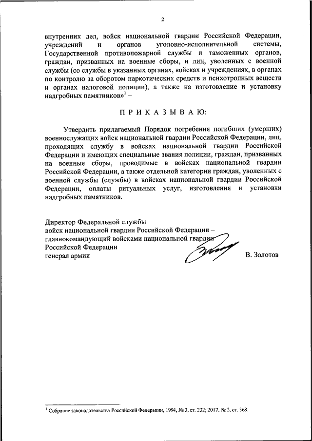 "ОБ УТВЕРЖДЕНИИ ПОРЯДКА ПОГРЕБЕНИЯ ПОГИБШИХ (УМЕРШИХ) ВОЕННОСЛУЖАЩИХ ВОЙСК НАЦИОНАЛЬНОЙ ГВАРДИИ РОССИЙСКОЙ ФЕДЕРАЦИИ, ЛИЦ, ПРОХОДЯЩИХ СЛУЖБУ В ВОЙСКАХ НАЦИОНАЛЬНОЙ ГВАРДИИ РОССИЙСКОЙ ФЕДЕРАЦИИ И ИМЕЮЩИХ СПЕЦИАЛЬНЫЕ ЗВАНИЯ ПОЛИЦИИ, ГРАЖДАН, ПРИЗВАННЫХ НА ВОЕННЫЕ СБОРЫ, ПРОВОДИМЫЕ В ВОЙСКАХ НАЦИОНАЛЬНОЙ ГВАРДИИ РОССИЙСКОЙ ФЕДЕРАЦИИ, А ТАКЖЕ ОТДЕЛЬНОЙ КАТЕГОРИИ ГРАЖДАН, УВОЛЕННЫХ С ВОЕННОЙ СЛУЖБЫ (СЛУЖБЫ) В ВОЙСКАХ НАЦИОНАЛЬНОЙ ГВАРДИИ РОССИЙСКОЙ ФЕДЕРАЦИИ, ОПЛАТЫ РИТУАЛЬНЫХ УСЛУГ, ИЗГОТОВЛЕНИЯ И УСТАНОВКИ НАДГРОБНЫХ ПАМЯТНИКОВ"