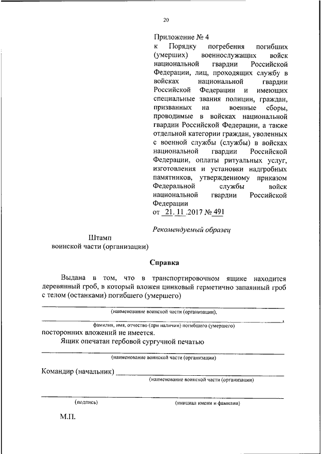 "ОБ УТВЕРЖДЕНИИ ПОРЯДКА ПОГРЕБЕНИЯ ПОГИБШИХ (УМЕРШИХ) ВОЕННОСЛУЖАЩИХ ВОЙСК НАЦИОНАЛЬНОЙ ГВАРДИИ РОССИЙСКОЙ ФЕДЕРАЦИИ, ЛИЦ, ПРОХОДЯЩИХ СЛУЖБУ В ВОЙСКАХ НАЦИОНАЛЬНОЙ ГВАРДИИ РОССИЙСКОЙ ФЕДЕРАЦИИ И ИМЕЮЩИХ СПЕЦИАЛЬНЫЕ ЗВАНИЯ ПОЛИЦИИ, ГРАЖДАН, ПРИЗВАННЫХ НА ВОЕННЫЕ СБОРЫ, ПРОВОДИМЫЕ В ВОЙСКАХ НАЦИОНАЛЬНОЙ ГВАРДИИ РОССИЙСКОЙ ФЕДЕРАЦИИ, А ТАКЖЕ ОТДЕЛЬНОЙ КАТЕГОРИИ ГРАЖДАН, УВОЛЕННЫХ С ВОЕННОЙ СЛУЖБЫ (СЛУЖБЫ) В ВОЙСКАХ НАЦИОНАЛЬНОЙ ГВАРДИИ РОССИЙСКОЙ ФЕДЕРАЦИИ, ОПЛАТЫ РИТУАЛЬНЫХ УСЛУГ, ИЗГОТОВЛЕНИЯ И УСТАНОВКИ НАДГРОБНЫХ ПАМЯТНИКОВ"