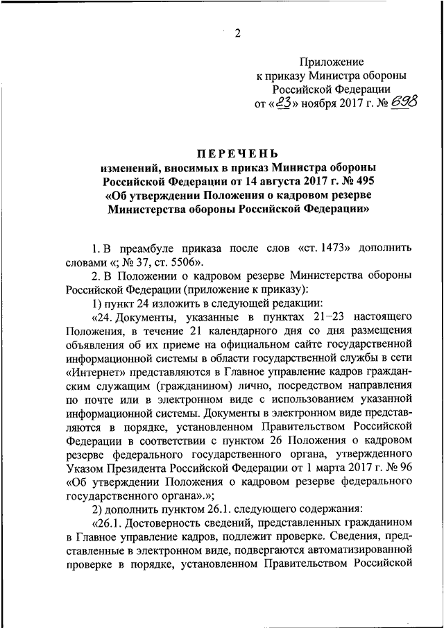 ПРИКАЗ Минобороны РФ от 23.11.2017 N 698