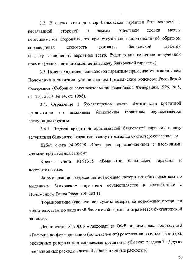 "О ПОРЯДКЕ ОТРАЖЕНИЯ НА СЧЕТАХ БУХГАЛТЕРСКОГО УЧЕТА КРЕДИТНЫМИ ОРГАНИЗАЦИЯМИ ОПЕРАЦИЙ ПО РАЗМЕЩЕНИЮ ДЕНЕЖНЫХ СРЕДСТВ ПО КРЕДИТНЫМ ДОГОВОРАМ, ОПЕРАЦИЙ, СВЯЗАННЫХ С ОСУЩЕСТВЛЕНИЕМ СДЕЛОК ПО ПРИОБРЕТЕНИЮ ПРАВА ТРЕБОВАНИЯ ОТ ТРЕТЬИХ ЛИЦ ИСПОЛНЕНИЯ ОБЯЗАТЕЛЬСТВ В ДЕНЕЖНОЙ ФОРМЕ, ОПЕРАЦИЙ ПО ОБЯЗАТЕЛЬСТВАМ ПО ВЫДАННЫМ БАНКОВСКИМ ГАРАНТИЯМ И ПРЕДОСТАВЛЕНИЮ ДЕНЕЖНЫХ СРЕДСТВ"