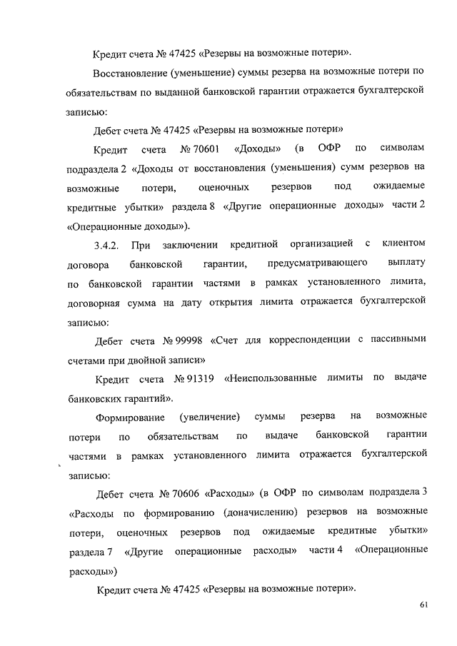 "О ПОРЯДКЕ ОТРАЖЕНИЯ НА СЧЕТАХ БУХГАЛТЕРСКОГО УЧЕТА КРЕДИТНЫМИ ОРГАНИЗАЦИЯМИ ОПЕРАЦИЙ ПО РАЗМЕЩЕНИЮ ДЕНЕЖНЫХ СРЕДСТВ ПО КРЕДИТНЫМ ДОГОВОРАМ, ОПЕРАЦИЙ, СВЯЗАННЫХ С ОСУЩЕСТВЛЕНИЕМ СДЕЛОК ПО ПРИОБРЕТЕНИЮ ПРАВА ТРЕБОВАНИЯ ОТ ТРЕТЬИХ ЛИЦ ИСПОЛНЕНИЯ ОБЯЗАТЕЛЬСТВ В ДЕНЕЖНОЙ ФОРМЕ, ОПЕРАЦИЙ ПО ОБЯЗАТЕЛЬСТВАМ ПО ВЫДАННЫМ БАНКОВСКИМ ГАРАНТИЯМ И ПРЕДОСТАВЛЕНИЮ ДЕНЕЖНЫХ СРЕДСТВ"