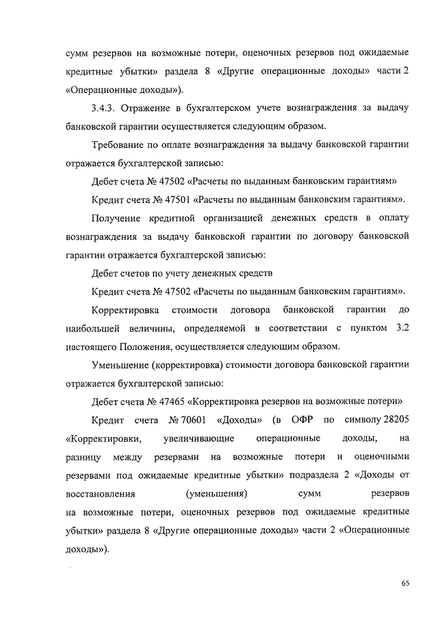 "О ПОРЯДКЕ ОТРАЖЕНИЯ НА СЧЕТАХ БУХГАЛТЕРСКОГО УЧЕТА КРЕДИТНЫМИ ОРГАНИЗАЦИЯМИ ОПЕРАЦИЙ ПО РАЗМЕЩЕНИЮ ДЕНЕЖНЫХ СРЕДСТВ ПО КРЕДИТНЫМ ДОГОВОРАМ, ОПЕРАЦИЙ, СВЯЗАННЫХ С ОСУЩЕСТВЛЕНИЕМ СДЕЛОК ПО ПРИОБРЕТЕНИЮ ПРАВА ТРЕБОВАНИЯ ОТ ТРЕТЬИХ ЛИЦ ИСПОЛНЕНИЯ ОБЯЗАТЕЛЬСТВ В ДЕНЕЖНОЙ ФОРМЕ, ОПЕРАЦИЙ ПО ОБЯЗАТЕЛЬСТВАМ ПО ВЫДАННЫМ БАНКОВСКИМ ГАРАНТИЯМ И ПРЕДОСТАВЛЕНИЮ ДЕНЕЖНЫХ СРЕДСТВ"