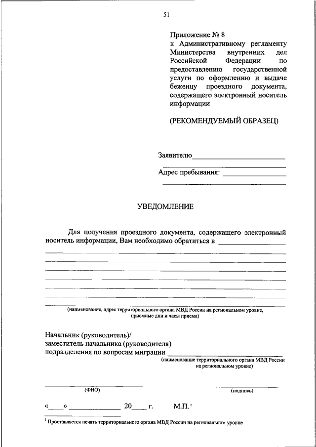 "ОБ УТВЕРЖДЕНИИ АДМИНИСТРАТИВНОГО РЕГЛАМЕНТА МИНИСТЕРСТВА ВНУТРЕННИХ ДЕЛ РОССИЙСКОЙ ФЕДЕРАЦИИ ПО ПРЕДОСТАВЛЕНИЮ ГОСУДАРСТВЕННОЙ УСЛУГИ ПО ОФОРМЛЕНИЮ И ВЫДАЧЕ БЕЖЕНЦУ ПРОЕЗДНОГО ДОКУМЕНТА, СОДЕРЖАЩЕГО ЭЛЕКТРОННЫЙ НОСИТЕЛЬ ИНФОРМАЦИИ"