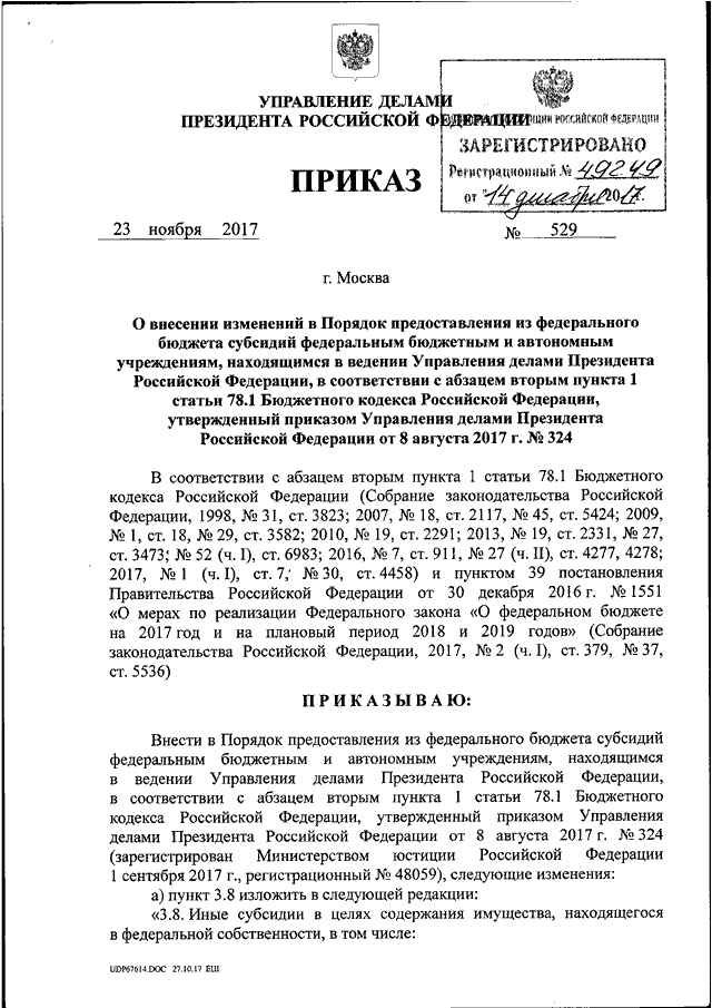 ПРИКАЗ Управления делами Президента РФ от 23.11.2017 N 529