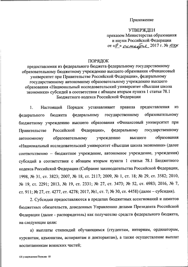 "ОБ УТВЕРЖДЕНИИ ПОРЯДКА ПРЕДОСТАВЛЕНИЯ ИЗ ФЕДЕРАЛЬНОГО БЮДЖЕТА ФЕДЕРАЛЬНОМУ ГОСУДАРСТВЕННОМУ ОБРАЗОВАТЕЛЬНОМУ БЮДЖЕТНОМУ УЧРЕЖДЕНИЮ ВЫСШЕГО ОБРАЗОВАНИЯ "ФИНАНСОВЫЙ УНИВЕРСИТЕТ ПРИ ПРАВИТЕЛЬСТВЕ РОССИЙСКОЙ ФЕДЕРАЦИИ", ФЕДЕРАЛЬНОМУ ГОСУДАРСТВЕННОМУ АВТОНОМНОМУ ОБРАЗОВАТЕЛЬНОМУ УЧРЕЖДЕНИЮ ВЫСШЕГО ОБРАЗОВАНИЯ "НАЦИОНАЛЬНЫЙ ИССЛЕДОВАТЕЛЬСКИЙ УНИВЕРСИТЕТ "ВЫСШАЯ ШКОЛА ЭКОНОМИКИ" СУБСИДИЙ В СООТВЕТСТВИИ С АБЗАЦЕМ ВТОРЫМ ПУНКТА 1 СТАТЬИ 78.1 БЮДЖЕТНОГО КОДЕКСА РОССИЙСКОЙ ФЕДЕРАЦИИ"
