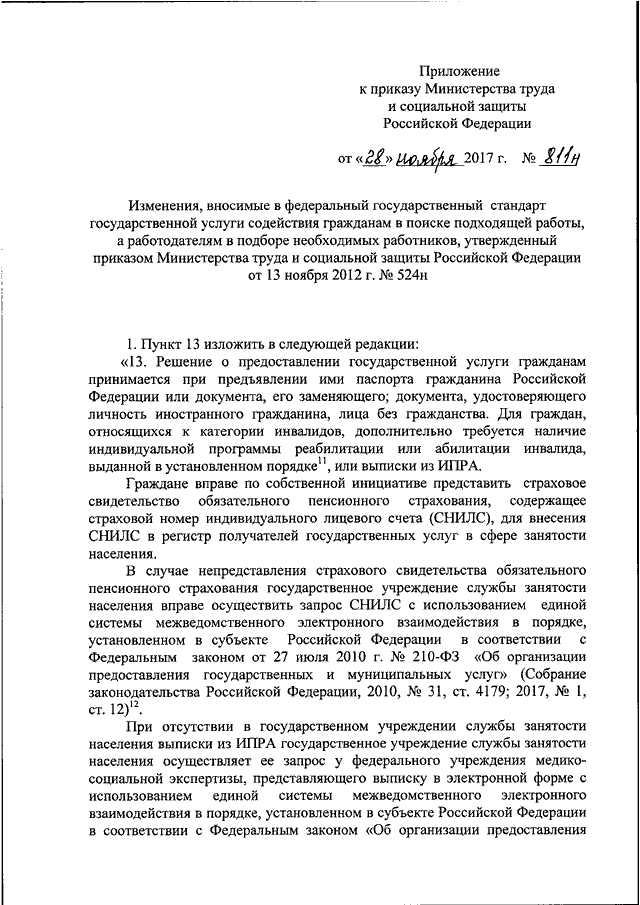 "О ВНЕСЕНИИ ИЗМЕНЕНИЙ В ФЕДЕРАЛЬНЫЙ ГОСУДАРСТВЕННЫЙ СТАНДАРТ ГОСУДАРСТВЕННОЙ УСЛУГИ СОДЕЙСТВИЯ ГРАЖДАНАМ В ПОИСКЕ ПОДХОДЯЩЕЙ РАБОТЫ, А РАБОТОДАТЕЛЯМ В ПОДБОРЕ НЕОБХОДИМЫХ РАБОТНИКОВ, УТВЕРЖДЕННЫЙ ПРИКАЗОМ МИНИСТЕРСТВА ТРУДА И СОЦИАЛЬНОЙ ЗАЩИТЫ РОССИЙСКОЙ ФЕДЕРАЦИИ ОТ 13 НОЯБРЯ 2012 Г. N 524Н"