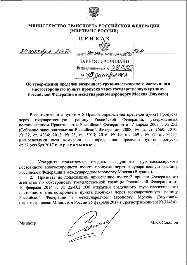 ПРИКАЗ Минтранса РФ от 30.11.2017 N 504