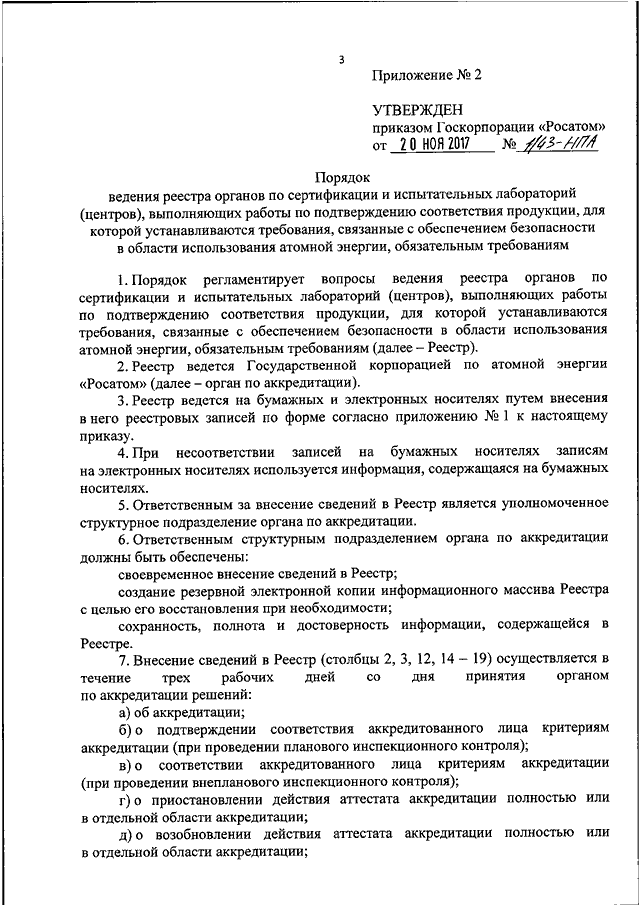 "Росатом" от 20.11.2017 N 1/43-НПА "О РЕЕСТРЕ ОРГАНОВ ПО СЕРТИФИКАЦИИ И ИСПЫТАТЕЛЬНЫХ ЛАБОРАТОРИЙ (ЦЕНТРОВ), ВЫПОЛНЯЮЩИХ РАБОТЫ ПО ПОДТВЕРЖДЕНИЮ СООТВЕТСТВИЯ ПРОДУКЦИИ, ДЛЯ КОТОРОЙ УСТАНАВЛИВАЮТСЯ ТРЕБОВАНИЯ, СВЯЗАННЫЕ С ОБЕСПЕЧЕНИЕМ БЕЗОПАСНОСТИ В ОБЛАСТИ ИСПОЛЬЗОВАНИЯ АТОМНОЙ ЭНЕРГИИ, ОБЯЗАТЕЛЬНЫМ ТРЕБОВАНИЯМ, РЕЕСТРЕ ЭКСПЕРТОВ ПО АККРЕДИТАЦИИ В ОБЛАСТИ ИСПОЛЬЗОВАНИЯ АТОМНОЙ ЭНЕРГИИ, РЕЕСТРЕ ВЫДАННЫХ СЕРТИФИКАТОВ СООТВЕТСТВИЯ ПРОДУКЦИИ, ДЛЯ КОТОРОЙ УСТАНАВЛИВАЮТСЯ ТРЕБОВАНИЯ, СВЯЗАННЫЕ С ОБЕСПЕЧЕНИЕМ БЕЗОПАСНОСТИ В ОБЛАСТИ ИСПОЛЬЗОВАНИЯ АТОМНОЙ ЭНЕРГИИ"