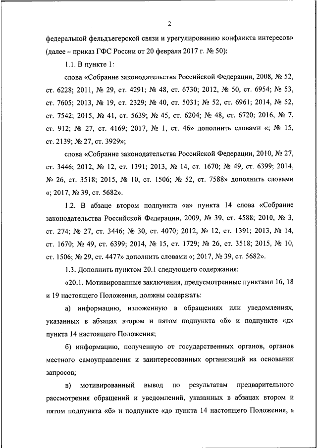 "О ВНЕСЕНИИ ИЗМЕНЕНИЙ В ПРИКАЗ ГОСУДАРСТВЕННОЙ ФЕЛЬДЪЕГЕРСКОЙ СЛУЖБЫ РОССИЙСКОЙ ФЕДЕРАЦИИ ОТ 20 ФЕВРАЛЯ 2017 Г. N 50 "ОБ УТВЕРЖДЕНИИ ПОЛОЖЕНИЯ ОБ АТТЕСТАЦИОННОЙ КОМИССИИ ГОСУДАРСТВЕННОЙ ФЕЛЬДЪЕГЕРСКОЙ СЛУЖБЫ РОССИЙСКОЙ ФЕДЕРАЦИИ ПО СОБЛЮДЕНИЮ ТРЕБОВАНИЙ К СЛУЖЕБНОМУ ПОВЕДЕНИЮ ЛИЦ НАЧАЛЬСТВУЮЩЕГО СОСТАВА ОРГАНОВ ФЕДЕРАЛЬНОЙ ФЕЛЬДЪЕГЕРСКОЙ СВЯЗИ И УРЕГУЛИРОВАНИЮ КОНФЛИКТА ИНТЕРЕСОВ И ПОРЯДКА ФОРМИРОВАНИЯ И ДЕЯТЕЛЬНОСТИ АТТЕСТАЦИОННЫХ КОМИССИЙ УПРАВЛЕНИЙ ГОСУДАРСТВЕННОЙ ФЕЛЬДЪЕГЕРСКОЙ СЛУЖБЫ РОССИЙСКОЙ ФЕДЕРАЦИИ ПО ФЕДЕРАЛЬНЫМ ОКРУГАМ И РЕГИОНАЛЬНЫХ УПРАВЛЕНИЙ ГОСУДАРСТВЕННОЙ ФЕЛЬДЪЕГЕРСКОЙ СЛУЖБЫ РОССИЙСКОЙ ФЕДЕРАЦИИ ПО СОБЛЮДЕНИЮ ТРЕБОВАНИЙ К СЛУЖЕБНОМУ ПОВЕДЕНИЮ ЛИЦ НАЧАЛЬСТВУЮЩЕГО СОСТАВА ОРГАНОВ ФЕДЕРАЛЬНОЙ ФЕЛЬДЪЕГЕРСКОЙ СВЯЗИ И УРЕГУЛИРОВАНИЮ КОНФЛИКТА ИНТЕРЕСОВ"