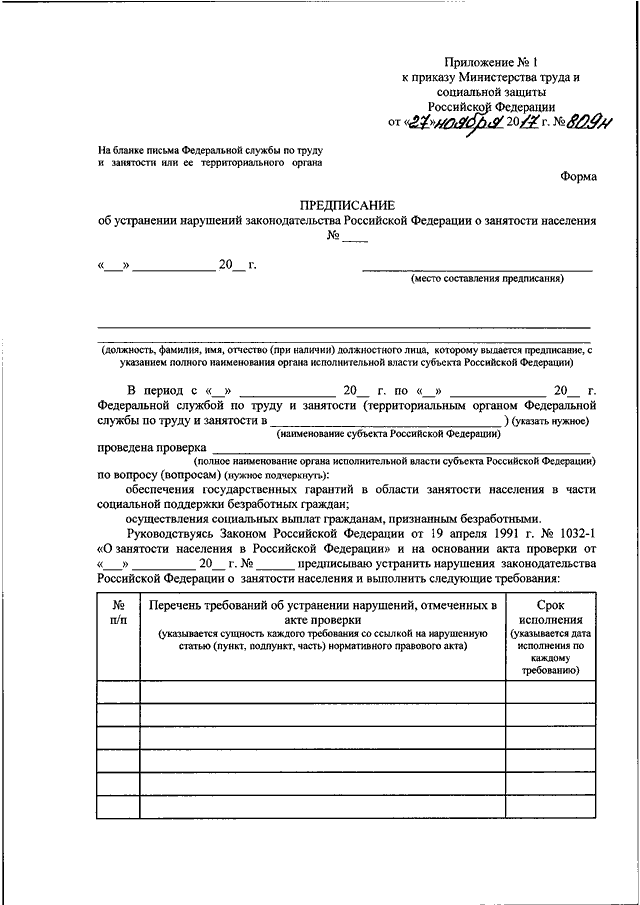 "ОБ УТВЕРЖДЕНИИ ФОРМ БЛАНКОВ ОБЯЗАТЕЛЬНЫХ ДЛЯ ИСПОЛНЕНИЯ ПРЕДПИСАНИЙ, ВЫДАВАЕМЫХ ФЕДЕРАЛЬНОЙ СЛУЖБОЙ ПО ТРУДУ И ЗАНЯТОСТИ И ЕЕ ТЕРРИТОРИАЛЬНЫМИ ОРГАНАМИ ПРИ ОСУЩЕСТВЛЕНИИ ФУНКЦИЙ ПО НАДЗОРУ И КОНТРОЛЮ В СФЕРЕ ЗАНЯТОСТИ НАСЕЛЕНИЯ, И ПЕРЕЧНЯ ДОЛЖНОСТНЫХ ЛИЦ ФЕДЕРАЛЬНОЙ СЛУЖБЫ ПО ТРУДУ И ЗАНЯТОСТИ И ЕЕ ТЕРРИТОРИАЛЬНЫХ ОРГАНОВ, УПОЛНОМОЧЕННЫХ ВЫДАВАТЬ ОБЯЗАТЕЛЬНЫЕ ДЛЯ ИСПОЛНЕНИЯ ПРЕДПИСАНИЯ ПРИ ОСУЩЕСТВЛЕНИИ НАДЗОРА И КОНТРОЛЯ В СФЕРЕ ЗАНЯТОСТИ НАСЕЛЕНИЯ"