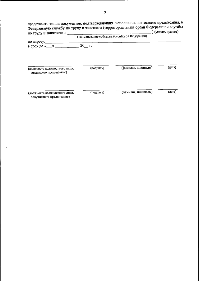 "ОБ УТВЕРЖДЕНИИ ФОРМ БЛАНКОВ ОБЯЗАТЕЛЬНЫХ ДЛЯ ИСПОЛНЕНИЯ ПРЕДПИСАНИЙ, ВЫДАВАЕМЫХ ФЕДЕРАЛЬНОЙ СЛУЖБОЙ ПО ТРУДУ И ЗАНЯТОСТИ И ЕЕ ТЕРРИТОРИАЛЬНЫМИ ОРГАНАМИ ПРИ ОСУЩЕСТВЛЕНИИ ФУНКЦИЙ ПО НАДЗОРУ И КОНТРОЛЮ В СФЕРЕ ЗАНЯТОСТИ НАСЕЛЕНИЯ, И ПЕРЕЧНЯ ДОЛЖНОСТНЫХ ЛИЦ ФЕДЕРАЛЬНОЙ СЛУЖБЫ ПО ТРУДУ И ЗАНЯТОСТИ И ЕЕ ТЕРРИТОРИАЛЬНЫХ ОРГАНОВ, УПОЛНОМОЧЕННЫХ ВЫДАВАТЬ ОБЯЗАТЕЛЬНЫЕ ДЛЯ ИСПОЛНЕНИЯ ПРЕДПИСАНИЯ ПРИ ОСУЩЕСТВЛЕНИИ НАДЗОРА И КОНТРОЛЯ В СФЕРЕ ЗАНЯТОСТИ НАСЕЛЕНИЯ"