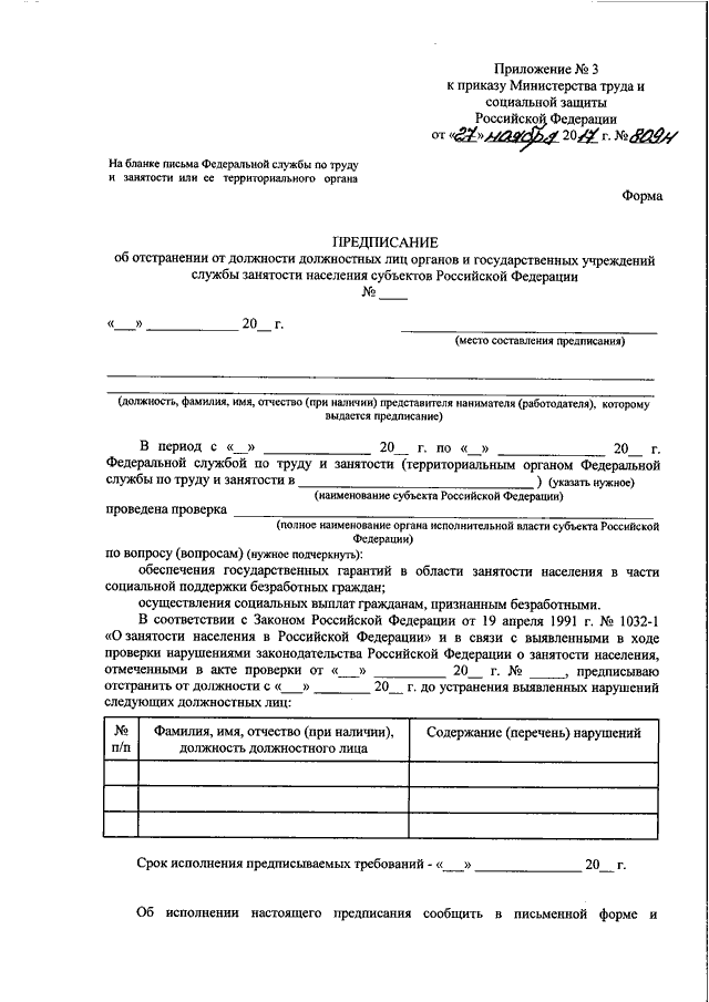 "ОБ УТВЕРЖДЕНИИ ФОРМ БЛАНКОВ ОБЯЗАТЕЛЬНЫХ ДЛЯ ИСПОЛНЕНИЯ ПРЕДПИСАНИЙ, ВЫДАВАЕМЫХ ФЕДЕРАЛЬНОЙ СЛУЖБОЙ ПО ТРУДУ И ЗАНЯТОСТИ И ЕЕ ТЕРРИТОРИАЛЬНЫМИ ОРГАНАМИ ПРИ ОСУЩЕСТВЛЕНИИ ФУНКЦИЙ ПО НАДЗОРУ И КОНТРОЛЮ В СФЕРЕ ЗАНЯТОСТИ НАСЕЛЕНИЯ, И ПЕРЕЧНЯ ДОЛЖНОСТНЫХ ЛИЦ ФЕДЕРАЛЬНОЙ СЛУЖБЫ ПО ТРУДУ И ЗАНЯТОСТИ И ЕЕ ТЕРРИТОРИАЛЬНЫХ ОРГАНОВ, УПОЛНОМОЧЕННЫХ ВЫДАВАТЬ ОБЯЗАТЕЛЬНЫЕ ДЛЯ ИСПОЛНЕНИЯ ПРЕДПИСАНИЯ ПРИ ОСУЩЕСТВЛЕНИИ НАДЗОРА И КОНТРОЛЯ В СФЕРЕ ЗАНЯТОСТИ НАСЕЛЕНИЯ"