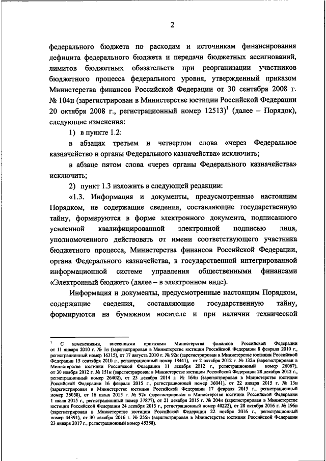 "О ВНЕСЕНИИ ИЗМЕНЕНИЙ В ПОРЯДОК ДОВЕДЕНИЯ БЮДЖЕТНЫХ АССИГНОВАНИЙ, ЛИМИТОВ БЮДЖЕТНЫХ ОБЯЗАТЕЛЬСТВ ПРИ ОРГАНИЗАЦИИ ИСПОЛНЕНИЯ ФЕДЕРАЛЬНОГО БЮДЖЕТА ПО РАСХОДАМ И ИСТОЧНИКАМ ФИНАНСИРОВАНИЯ ДЕФИЦИТА ФЕДЕРАЛЬНОГО БЮДЖЕТА И ПЕРЕДАЧИ БЮДЖЕТНЫХ АССИГНОВАНИЙ, ЛИМИТОВ БЮДЖЕТНЫХ ОБЯЗАТЕЛЬСТВ ПРИ РЕОРГАНИЗАЦИИ УЧАСТНИКОВ БЮДЖЕТНОГО ПРОЦЕССА ФЕДЕРАЛЬНОГО УРОВНЯ, УТВЕРЖДЕННЫЙ ПРИКАЗОМ МИНИСТЕРСТВА ФИНАНСОВ РОССИЙСКОЙ ФЕДЕРАЦИИ ОТ 30 СЕНТЯБРЯ 2008 Г. N 104Н, А ТАКЖЕ О ПРИЗНАНИИ УТРАТИВШИМИ СИЛУ ОТДЕЛЬНЫХ ПОЛОЖЕНИЙ ПОДПУНКТА 2 ПУНКТА 5 ИЗМЕНЕНИЙ, ВНОСИМЫХ В ОТДЕЛЬНЫЕ ПРИКАЗЫ МИНИСТЕРСТВА ФИНАНСОВ РОССИЙСКОЙ ФЕДЕРАЦИИ, УТВЕРЖДЕННЫХ ПРИКАЗОМ МИНИСТЕРСТВА ФИНАНСОВ РОССИЙСКОЙ ФЕДЕРАЦИИ ОТ 17 АВГУСТА 2010 Г. N 92Н, И ПОДПУНКТА 5 ПУНКТА 2 ИЗМЕНЕНИЙ, КОТОРЫЕ ВНОСЯТСЯ В НОРМАТИВНЫЕ ПРАВОВЫЕ АКТЫ МИНИСТЕРСТВА ФИНАНСОВ РОССИЙСКОЙ ФЕДЕРАЦИИ, УТВЕРЖДЕННЫХ ПРИКАЗОМ МИНИСТЕРСТВА ФИНАНСОВ РОССИЙСКОЙ ФЕДЕРАЦИИ ОТ 23 ДЕКАБРЯ 2014 Г. N 164Н"