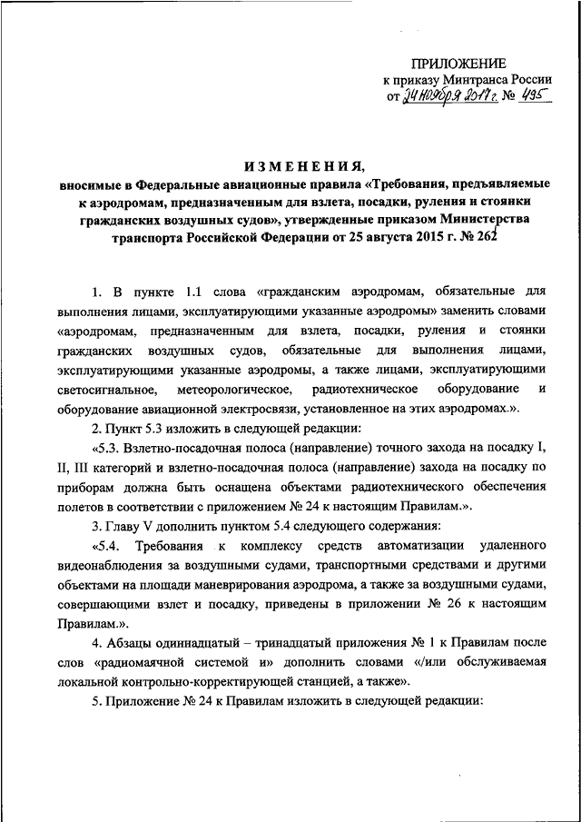 "О ВНЕСЕНИИ ИЗМЕНЕНИЙ В ФЕДЕРАЛЬНЫЕ АВИАЦИОННЫЕ ПРАВИЛА "ТРЕБОВАНИЯ, ПРЕДЪЯВЛЯЕМЫЕ К АЭРОДРОМАМ, ПРЕДНАЗНАЧЕННЫМ ДЛЯ ВЗЛЕТА, ПОСАДКИ, РУЛЕНИЯ И СТОЯНКИ ГРАЖДАНСКИХ ВОЗДУШНЫХ СУДОВ", УТВЕРЖДЕННЫЕ ПРИКАЗОМ МИНИСТЕРСТВА ТРАНСПОРТА РОССИЙСКОЙ ФЕДЕРАЦИИ ОТ 25 АВГУСТА 2015 Г. N 262"