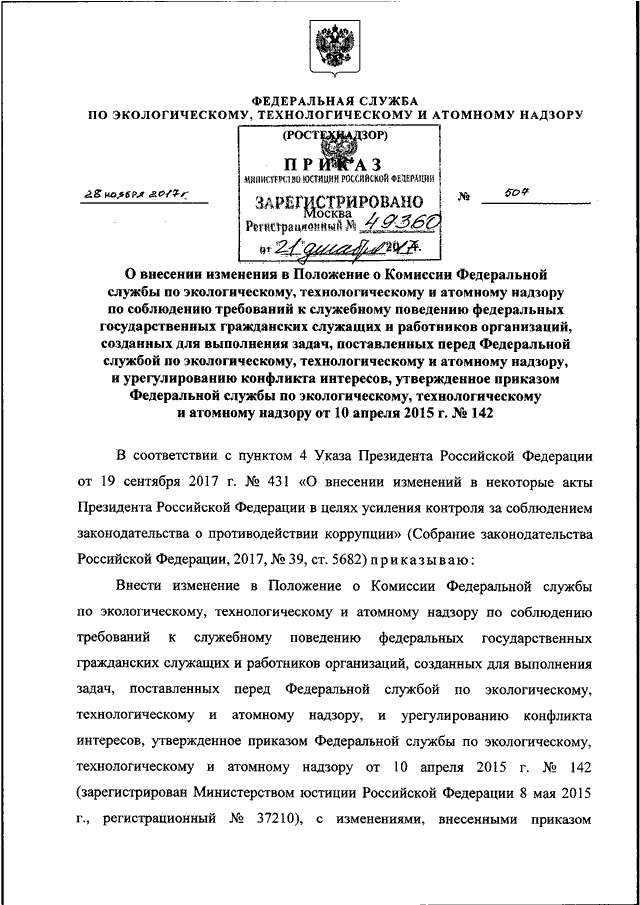 "О ВНЕСЕНИИ ИЗМЕНЕНИЯ В ПОЛОЖЕНИЕ О КОМИССИИ ФЕДЕРАЛЬНОЙ СЛУЖБЫ ПО ЭКОЛОГИЧЕСКОМУ, ТЕХНОЛОГИЧЕСКОМУ И АТОМНОМУ НАДЗОРУ ПО СОБЛЮДЕНИЮ ТРЕБОВАНИЙ К СЛУЖЕБНОМУ ПОВЕДЕНИЮ ФЕДЕРАЛЬНЫХ ГОСУДАРСТВЕННЫХ ГРАЖДАНСКИХ СЛУЖАЩИХ И РАБОТНИКОВ ОРГАНИЗАЦИЙ, СОЗДАННЫХ ДЛЯ ВЫПОЛНЕНИЯ ЗАДАЧ, ПОСТАВЛЕННЫХ ПЕРЕД ФЕДЕРАЛЬНОЙ СЛУЖБОЙ ПО ЭКОЛОГИЧЕСКОМУ, ТЕХНОЛОГИЧЕСКОМУ И АТОМНОМУ НАДЗОРУ, И УРЕГУЛИРОВАНИЮ КОНФЛИКТА ИНТЕРЕСОВ, УТВЕРЖДЕННОЕ ПРИКАЗОМ ФЕДЕРАЛЬНОЙ СЛУЖБЫ ПО ЭКОЛОГИЧЕСКОМУ, ТЕХНОЛОГИЧЕСКОМУ И АТОМНОМУ НАДЗОРУ ОТ 10 АПРЕЛЯ 2015 Г. N 142"