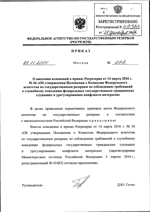 ПРИКАЗ Росрезерва от 28.11.2017 N 262