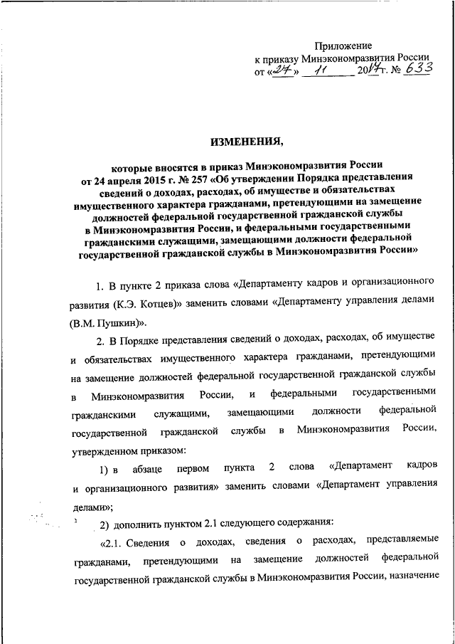 "О ВНЕСЕНИИ ИЗМЕНЕНИЙ В ПРИКАЗ МИНЭКОНОМРАЗВИТИЯ РОССИИ ОТ 24 АПРЕЛЯ 2015 Г. N 257 "ОБ УТВЕРЖДЕНИИ ПОРЯДКА ПРЕДСТАВЛЕНИЯ СВЕДЕНИЙ О ДОХОДАХ, РАСХОДАХ, ОБ ИМУЩЕСТВЕ И ОБЯЗАТЕЛЬСТВАХ ИМУЩЕСТВЕННОГО ХАРАКТЕРА ГРАЖДАНАМИ, ПРЕТЕНДУЮЩИМИ НА ЗАМЕЩЕНИЕ ДОЛЖНОСТЕЙ ФЕДЕРАЛЬНОЙ ГОСУДАРСТВЕННОЙ ГРАЖДАНСКОЙ СЛУЖБЫ В МИНЭКОНОМРАЗВИТИЯ РОССИИ, И ФЕДЕРАЛЬНЫМИ ГОСУДАРСТВЕННЫМИ ГРАЖДАНСКИМИ СЛУЖАЩИМИ, ЗАМЕЩАЮЩИМИ ДОЛЖНОСТИ ФЕДЕРАЛЬНОЙ ГОСУДАРСТВЕННОЙ ГРАЖДАНСКОЙ СЛУЖБЫ В МИНЭКОНОМРАЗВИТИЯ РОССИИ"