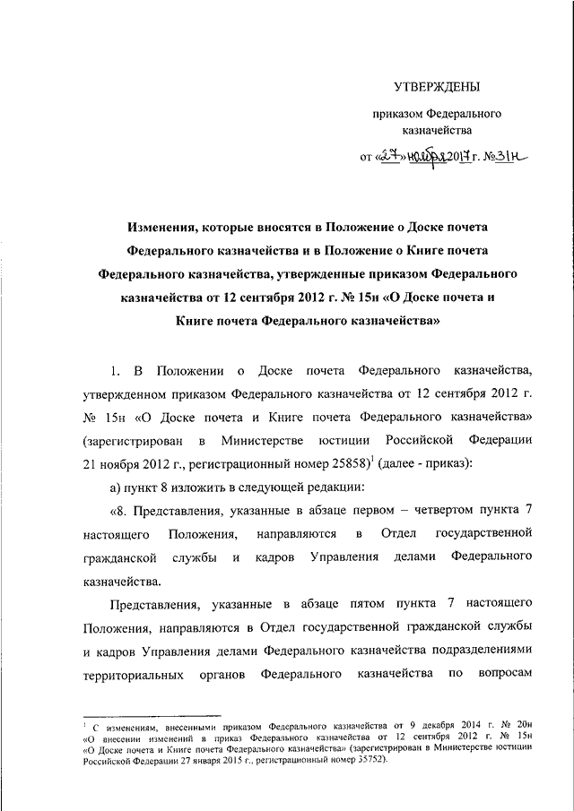 "О ВНЕСЕНИИ ИЗМЕНЕНИЙ В ПОЛОЖЕНИЕ О ДОСКЕ ПОЧЕТА ФЕДЕРАЛЬНОГО КАЗНАЧЕЙСТВА И В ПОЛОЖЕНИЕ О КНИГЕ ПОЧЕТА ФЕДЕРАЛЬНОГО КАЗНАЧЕЙСТВА, УТВЕРЖДЕННЫЕ ПРИКАЗОМ ФЕДЕРАЛЬНОГО КАЗНАЧЕЙСТВА ОТ 12 СЕНТЯБРЯ 2012 Г. N 15Н"
