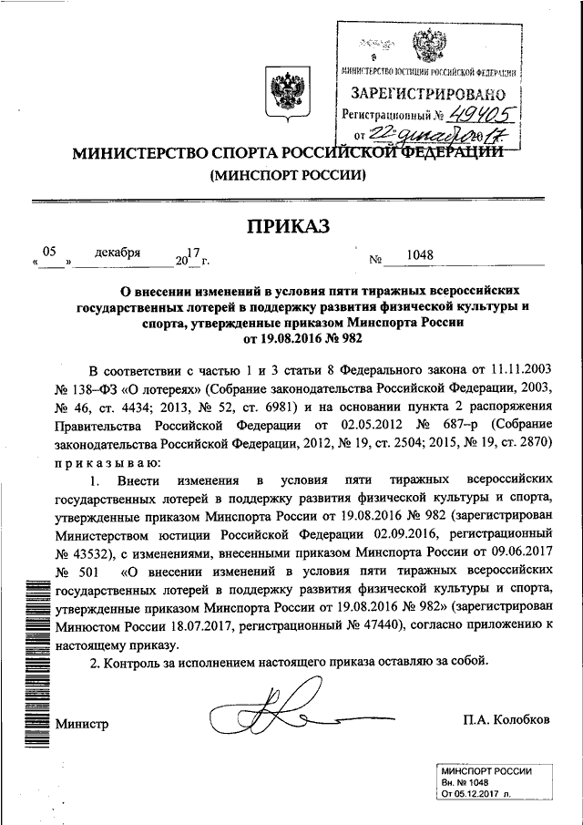 ПРИКАЗ Минспорта РФ от 05.12.2017 N 1048