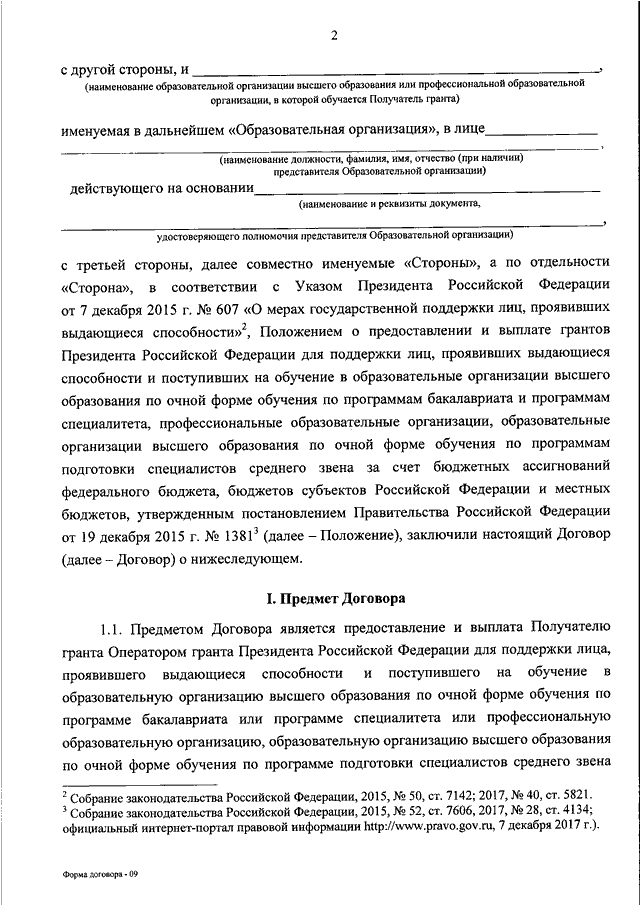 "ОБ УТВЕРЖДЕНИИ ФОРМЫ ДОГОВОРА О ПРЕДОСТАВЛЕНИИ ГРАНТА ПРЕЗИДЕНТА РОССИЙСКОЙ ФЕДЕРАЦИИ ДЛЯ ПОДДЕРЖКИ ЛИЦА, ПРОЯВИВШЕГО ВЫДАЮЩИЕСЯ СПОСОБНОСТИ И ПОСТУПИВШЕГО НА ОБУЧЕНИЕ В ОБРАЗОВАТЕЛЬНУЮ ОРГАНИЗАЦИЮ ВЫСШЕГО ОБРАЗОВАНИЯ ПО ОЧНОЙ ФОРМЕ ОБУЧЕНИЯ ПО ПРОГРАММЕ БАКАЛАВРИАТА ИЛИ ПРОГРАММЕ СПЕЦИАЛИТЕТА, ПРОФЕССИОНАЛЬНУЮ ОБРАЗОВАТЕЛЬНУЮ ОРГАНИЗАЦИЮ, ОБРАЗОВАТЕЛЬНУЮ ОРГАНИЗАЦИЮ ВЫСШЕГО ОБРАЗОВАНИЯ ПО ОЧНОЙ ФОРМЕ ОБУЧЕНИЯ ПО ПРОГРАММЕ ПОДГОТОВКИ СПЕЦИАЛИСТОВ СРЕДНЕГО ЗВЕНА ЗА СЧЕТ БЮДЖЕТНЫХ АССИГНОВАНИЙ ФЕДЕРАЛЬНОГО БЮДЖЕТА, БЮДЖЕТОВ СУБЪЕКТОВ РОССИЙСКОЙ ФЕДЕРАЦИИ ИЛИ МЕСТНЫХ БЮДЖЕТОВ"