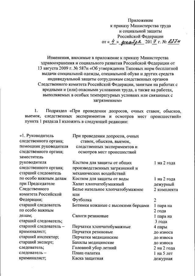 "О ВНЕСЕНИИ ИЗМЕНЕНИЙ В ПРИЛОЖЕНИЕ К ПРИКАЗУ МИНИСТЕРСТВА ЗДРАВООХРАНЕНИЯ И СОЦИАЛЬНОГО РАЗВИТИЯ РОССИЙСКОЙ ФЕДЕРАЦИИ ОТ 13 АВГУСТА 2009 Г. N 587Н "ОБ УТВЕРЖДЕНИИ ТИПОВЫХ НОРМ БЕСПЛАТНОЙ ВЫДАЧИ СПЕЦИАЛЬНОЙ ОДЕЖДЫ, СПЕЦИАЛЬНОЙ ОБУВИ И ДРУГИХ СРЕДСТВ ИНДИВИДУАЛЬНОЙ ЗАЩИТЫ СОТРУДНИКАМ СЛЕДСТВЕННЫХ ОРГАНОВ СЛЕДСТВЕННОГО КОМИТЕТА РОССИЙСКОЙ ФЕДЕРАЦИИ, ЗАНЯТЫМ НА РАБОТАХ С ВРЕДНЫМИ И (ИЛИ) ОПАСНЫМИ УСЛОВИЯМИ ТРУДА, А ТАКЖЕ НА РАБОТАХ, ВЫПОЛНЯЕМЫХ В ОСОБЫХ ТЕМПЕРАТУРНЫХ УСЛОВИЯХ ИЛИ СВЯЗАННЫХ С ЗАГРЯЗНЕНИЕМ"