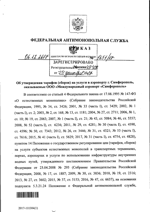 ПРИКАЗ Федеральной антимонопольной службы от 06.12.2017 N 1651/17
