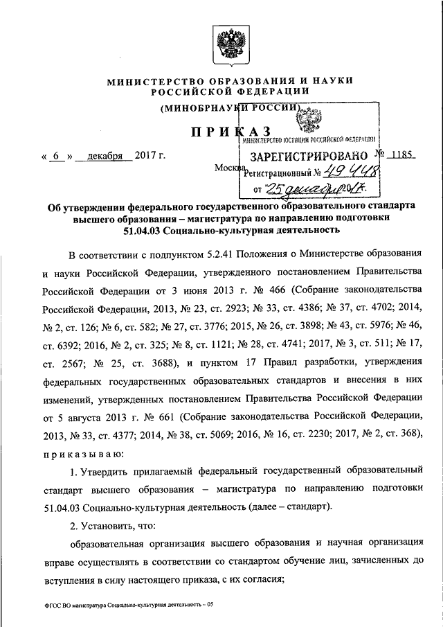 ПРИКАЗ Минобрнауки РФ от 06.12.2017 N 1185