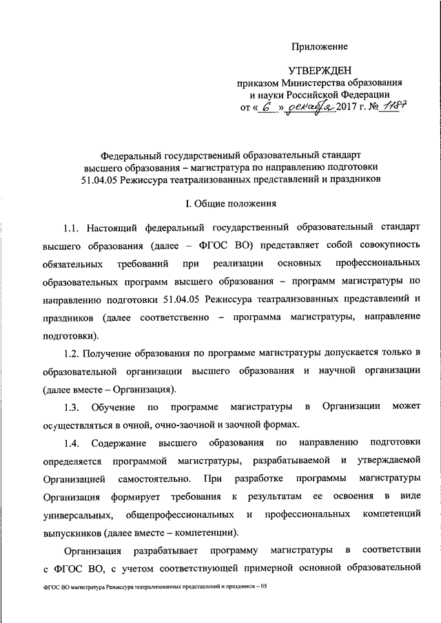 "ОБ УТВЕРЖДЕНИИ ФЕДЕРАЛЬНОГО ГОСУДАРСТВЕННОГО ОБРАЗОВАТЕЛЬНОГО СТАНДАРТА ВЫСШЕГО ОБРАЗОВАНИЯ - МАГИСТРАТУРА ПО НАПРАВЛЕНИЮ ПОДГОТОВКИ 51.04.05 РЕЖИССУРА ТЕАТРАЛИЗОВАННЫХ ПРЕДСТАВЛЕНИЙ И ПРАЗДНИКОВ"