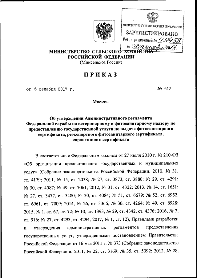 ПРИКАЗ Минсельхоза РФ от 06.12.2017 N 612