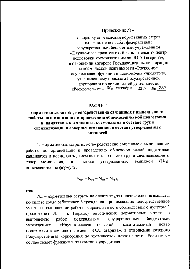 "Роскосмос" от 30.10.2017 N 382 "ОБ УТВЕРЖДЕНИИ ПОРЯДКА ОПРЕДЕЛЕНИЯ НОРМАТИВНЫХ ЗАТРАТ НА ВЫПОЛНЕНИЕ РАБОТ ФЕДЕРАЛЬНЫМ ГОСУДАРСТВЕННЫМ БЮДЖЕТНЫМ УЧРЕЖДЕНИЕМ "НАУЧНО - ИССЛЕДОВАТЕЛЬСКИЙ ИСПЫТАТЕЛЬНЫЙ ЦЕНТР ПОДГОТОВКИ КОСМОНАВТОВ ИМЕНИ Ю.А. ГАГАРИНА", В ОТНОШЕНИИ КОТОРОГО ГОСУДАРСТВЕННАЯ КОРПОРАЦИЯ ПО КОСМИЧЕСКОЙ ДЕЯТЕЛЬНОСТИ "РОСКОСМОС" ОСУЩЕСТВЛЯЕТ ФУНКЦИИ И ПОЛНОМОЧИЯ УЧРЕДИТЕЛЯ"
