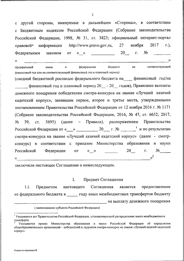 "ОБ УТВЕРЖДЕНИИ ФОРМЫ СОГЛАШЕНИЯ МЕЖДУ МИНИСТЕРСТВОМ ОБРАЗОВАНИЯ И НАУКИ РОССИЙСКОЙ ФЕДЕРАЦИИ И ВЫСШИМ ИСПОЛНИТЕЛЬНЫМ ОРГАНОМ ГОСУДАРСТВЕННОЙ ВЛАСТИ СУБЪЕКТА РОССИЙСКОЙ ФЕДЕРАЦИИ О ПРЕДОСТАВЛЕНИИ ИЗ ФЕДЕРАЛЬНОГО БЮДЖЕТА ИНЫХ МЕЖБЮДЖЕТНЫХ ТРАНСФЕРТОВ БЮДЖЕТУ СУБЪЕКТА РОССИЙСКОЙ ФЕДЕРАЦИИ НА ВЫПЛАТУ ДЕНЕЖНОГО ПООЩРЕНИЯ ОБЩЕОБРАЗОВАТЕЛЬНЫМ ОРГАНИЗАЦИЯМ - ПОБЕДИТЕЛЯМ СМОТРА - КОНКУРСА НА ЗВАНИЕ "ЛУЧШИЙ КАЗАЧИЙ КАДЕТСКИЙ КОРПУС", ЯВЛЯЮЩИМСЯ ГОСУДАРСТВЕННЫМИ КАЗЕННЫМИ УЧРЕЖДЕНИЯМИ СУБЪЕКТА РОССИЙСКОЙ ФЕДЕРАЦИИ (МУНИЦИПАЛЬНЫМИ КАЗЕННЫМИ УЧРЕЖДЕНИЯМИ), ЗАНЯВШИМ ПЕРВОЕ, ВТОРОЕ И ТРЕТЬЕ МЕСТА"