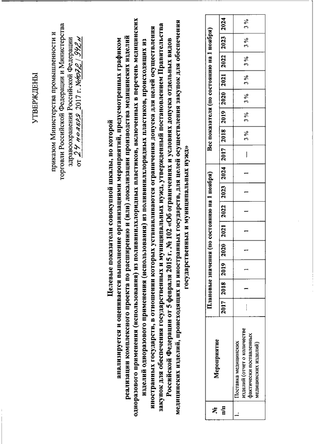 "ОБ УТВЕРЖДЕНИИ ЦЕЛЕВЫХ ПОКАЗАТЕЛЕЙ СОВОКУПНОЙ ШКАЛЫ, ПО КОТОРОЙ АНАЛИЗИРУЕТСЯ И ОЦЕНИВАЕТСЯ ВЫПОЛНЕНИЕ ОРГАНИЗАЦИЯМИ МЕРОПРИЯТИЙ, ПРЕДУСМОТРЕННЫХ ГРАФИКОМ РЕАЛИЗАЦИИ КОМПЛЕКСНОГО ПРОЕКТА ПО РАСШИРЕНИЮ И (ИЛИ) ЛОКАЛИЗАЦИИ ПРОИЗВОДСТВА МЕДИЦИНСКИХ ИЗДЕЛИЙ ОДНОРАЗОВОГО ПРИМЕНЕНИЯ (ИСПОЛЬЗОВАНИЯ) ИЗ ПОЛИВИНИЛХЛОРИДНЫХ ПЛАСТИКОВ, ВКЛЮЧЕННЫХ В ПЕРЕЧЕНЬ МЕДИЦИНСКИХ ИЗДЕЛИЙ ОДНОРАЗОВОГО ПРИМЕНЕНИЯ (ИСПОЛЬЗОВАНИЯ) ИЗ ПОЛИВИНИЛХЛОРИДНЫХ ПЛАСТИКОВ, ПРОИСХОДЯЩИХ ИЗ ИНОСТРАННЫХ ГОСУДАРСТВ, В ОТНОШЕНИИ КОТОРЫХ УСТАНАВЛИВАЮТСЯ ОГРАНИЧЕНИЯ ДОПУСКА ДЛЯ ЦЕЛЕЙ ОСУЩЕСТВЛЕНИЯ ЗАКУПОК ДЛЯ ОБЕСПЕЧЕНИЯ ГОСУДАРСТВЕННЫХ И МУНИЦИПАЛЬНЫХ НУЖД, УТВЕРЖДЕННЫЙ ПОСТАНОВЛЕНИЕМ ПРАВИТЕЛЬСТВА РОССИЙСКОЙ ФЕДЕРАЦИИ ОТ 5 ФЕВРАЛЯ 2015 Г. N 102 "ОБ ОГРАНИЧЕНИЯХ И УСЛОВИЯХ ДОПУСКА ОТДЕЛЬНЫХ ВИДОВ МЕДИЦИНСКИХ ИЗДЕЛИЙ, ПРОИСХОДЯЩИХ ИЗ ИНОСТРАННЫХ ГОСУДАРСТВ, ДЛЯ ЦЕЛЕЙ ОСУЩЕСТВЛЕНИЯ ЗАКУПОК ДЛЯ ОБЕСПЕЧЕНИЯ ГОСУДАРСТВЕННЫХ И МУНИЦИПАЛЬНЫХ НУЖД"
