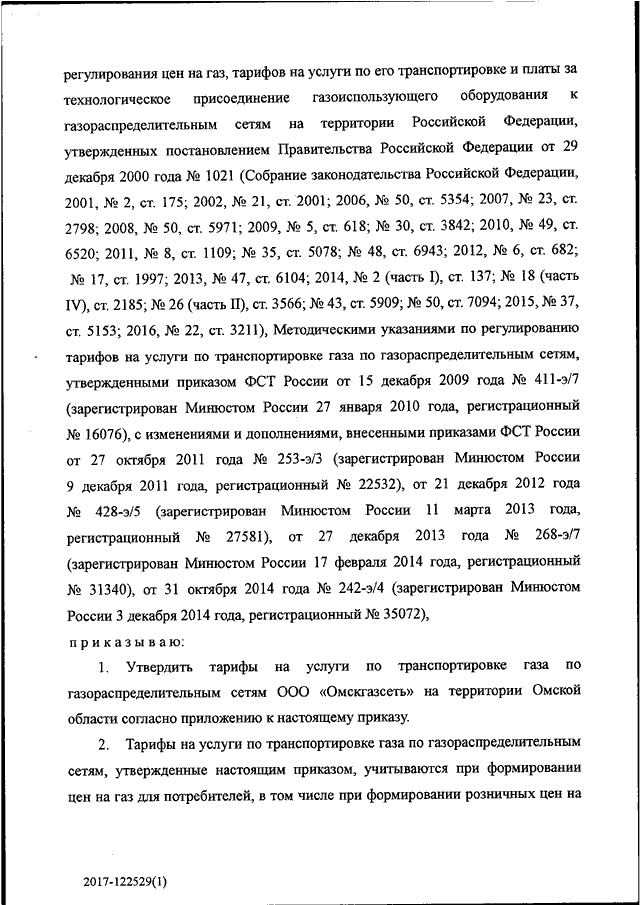 "ОБ УТВЕРЖДЕНИИ ТАРИФОВ НА УСЛУГИ ПО ТРАНСПОРТИРОВКЕ ГАЗА ПО ГАЗОРАСПРЕДЕЛИТЕЛЬНЫМ СЕТЯМ ООО "ОМСКГАЗСЕТЬ" НА ТЕРРИТОРИИ ОМСКОЙ ОБЛАСТИ"