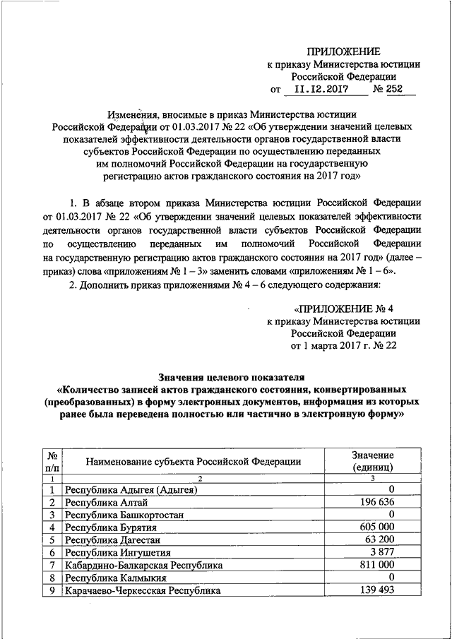 "О ВНЕСЕНИИ ИЗМЕНЕНИЙ В ПРИКАЗ МИНИСТЕРСТВА ЮСТИЦИИ РОССИЙСКОЙ ФЕДЕРАЦИИ ОТ 01.03.2017 N 22 "ОБ УТВЕРЖДЕНИИ ЗНАЧЕНИЙ ЦЕЛЕВЫХ ПОКАЗАТЕЛЕЙ ЭФФЕКТИВНОСТИ ДЕЯТЕЛЬНОСТИ ОРГАНОВ ГОСУДАРСТВЕННОЙ ВЛАСТИ СУБЪЕКТОВ РОССИЙСКОЙ ФЕДЕРАЦИИ ПО ОСУЩЕСТВЛЕНИЮ ПЕРЕДАННЫХ ИМ ПОЛНОМОЧИЙ РОССИЙСКОЙ ФЕДЕРАЦИИ НА ГОСУДАРСТВЕННУЮ РЕГИСТРАЦИЮ АКТОВ ГРАЖДАНСКОГО СОСТОЯНИЯ НА 2017 ГОД"