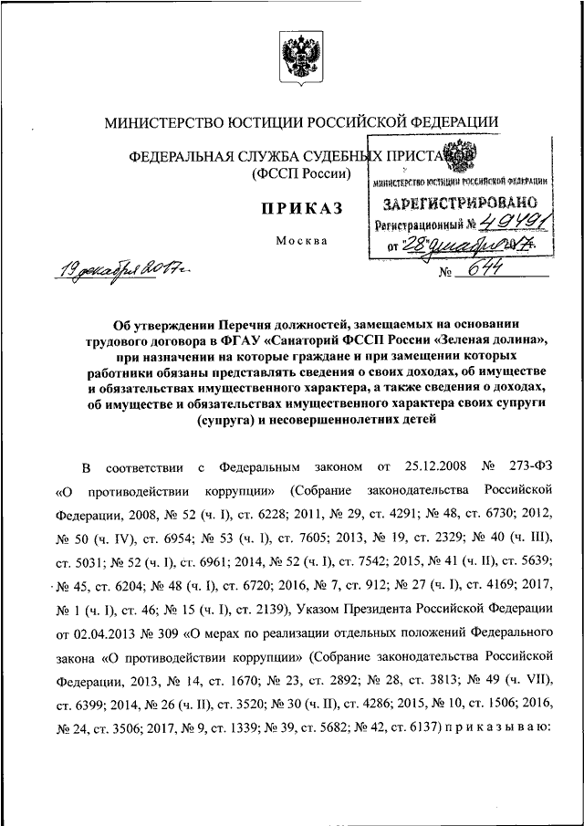ПРИКАЗ ФССП РФ от 19.12.2017 N 644