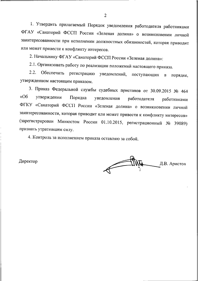"ОБ УТВЕРЖДЕНИИ ПОРЯДКА УВЕДОМЛЕНИЯ РАБОТОДАТЕЛЯ РАБОТНИКАМИ ФГАУ "САНАТОРИЙ ФССП РОССИИ "ЗЕЛЕНАЯ ДОЛИНА" О ВОЗНИКНОВЕНИИ ЛИЧНОЙ ЗАИНТЕРЕСОВАННОСТИ ПРИ ИСПОЛНЕНИИ ДОЛЖНОСТНЫХ ОБЯЗАННОСТЕЙ, КОТОРАЯ ПРИВОДИТ ИЛИ МОЖЕТ ПРИВЕСТИ К КОНФЛИКТУ ИНТЕРЕСОВ"
