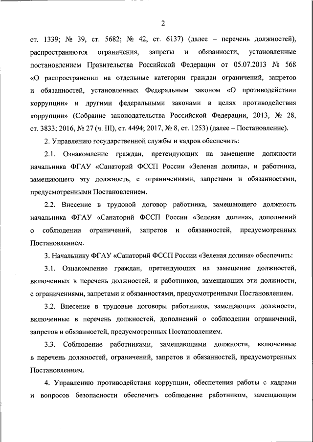 "О РАСПРОСТРАНЕНИИ НА ОТДЕЛЬНЫЕ КАТЕГОРИИ РАБОТНИКОВ, ЗАМЕЩАЮЩИХ ДОЛЖНОСТИ В ФГАУ "САНАТОРИЙ ФССП РОССИИ "ЗЕЛЕНАЯ ДОЛИНА", ОГРАНИЧЕНИЙ, ЗАПРЕТОВ И ОБЯЗАННОСТЕЙ"