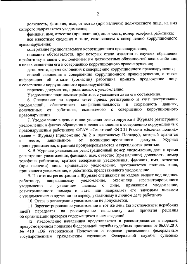 "ОБ УТВЕРЖДЕНИИ ПОРЯДКА УВЕДОМЛЕНИЯ РАБОТОДАТЕЛЯ О ФАКТАХ ОБРАЩЕНИЯ В ЦЕЛЯХ СКЛОНЕНИЯ К СОВЕРШЕНИЮ КОРРУПЦИОННЫХ ПРАВОНАРУШЕНИЙ РАБОТНИКОВ, ЗАМЕЩАЮЩИХ ДОЛЖНОСТИ НА ОСНОВАНИИ ТРУДОВОГО ДОГОВОРА В ФГАУ "САНАТОРИЙ ФССП РОССИИ "ЗЕЛЕНАЯ ДОЛИНА"