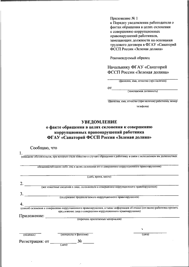 "ОБ УТВЕРЖДЕНИИ ПОРЯДКА УВЕДОМЛЕНИЯ РАБОТОДАТЕЛЯ О ФАКТАХ ОБРАЩЕНИЯ В ЦЕЛЯХ СКЛОНЕНИЯ К СОВЕРШЕНИЮ КОРРУПЦИОННЫХ ПРАВОНАРУШЕНИЙ РАБОТНИКОВ, ЗАМЕЩАЮЩИХ ДОЛЖНОСТИ НА ОСНОВАНИИ ТРУДОВОГО ДОГОВОРА В ФГАУ "САНАТОРИЙ ФССП РОССИИ "ЗЕЛЕНАЯ ДОЛИНА"