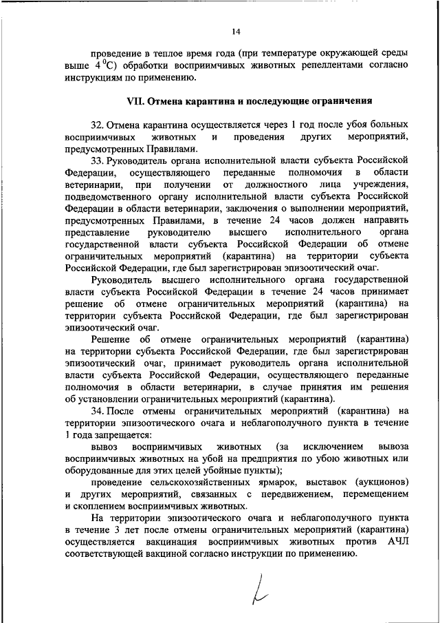 "ОБ УТВЕРЖДЕНИИ ВЕТЕРИНАРНЫХ ПРАВИЛ ОСУЩЕСТВЛЕНИЯ ПРОФИЛАКТИЧЕСКИХ, ДИАГНОСТИЧЕСКИХ, ОГРАНИЧИТЕЛЬНЫХ И ИНЫХ МЕРОПРИЯТИЙ, УСТАНОВЛЕНИЯ И ОТМЕНЫ КАРАНТИНА И ИНЫХ ОГРАНИЧЕНИЙ, НАПРАВЛЕННЫХ НА ПРЕДОТВРАЩЕНИЕ РАСПРОСТРАНЕНИЯ И ЛИКВИДАЦИЮ ОЧАГОВ АФРИКАНСКОЙ ЧУМЫ ЛОШАДЕЙ"