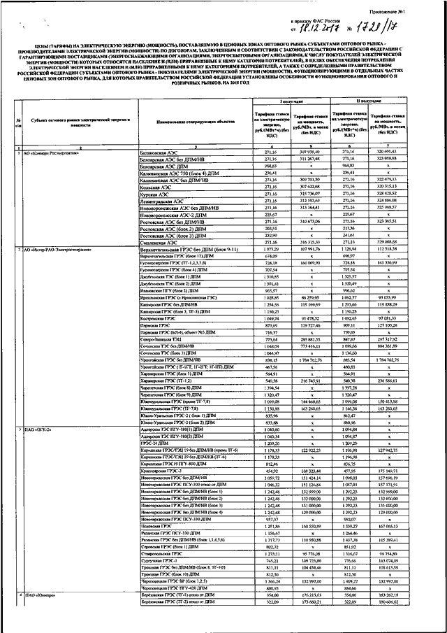 "ОБ УТВЕРЖДЕНИИ ЦЕН (ТАРИФОВ НА ЭЛЕКТРИЧЕСКУЮ ЭНЕРГИЮ (МОЩНОСТЬ), ПОСТАВЛЯЕМУЮ В ЦЕНОВЫХ ЗОНАХ ОПТОВОГО РЫНКА СУБЪЕКТАМИ ОПТОВОГО РЫНКА - ПРОИЗВОДИТЕЛЯМИ ЭЛЕКТРИЧЕСКОЙ ЭНЕРГИИ (МОЩНОСТИ) ПО ДОГОВОРАМ, ЗАКЛЮЧЕННЫМ В СООТВЕТСТВИИ С ЗАКОНОДАТЕЛЬСТВОМ РОССИЙСКОЙ ФЕДЕРАЦИИ С ГАРАНТИРУЮЩИМИ ПОСТАВЩИКАМИ (ЭНЕРГОСНАБЖАЮЩИМИ ОРГАНИЗАЦИЯМИ, ЭНЕРГОСБЫТОВЫМИ ОРГАНИЗАЦИЯМИ, К ЧИСЛУ ПОКУПАТЕЛЕЙ ЭЛЕКТРИЧЕСКОЙ ЭНЕРГИИ (МОЩНОСТИ) КОТОРЫХ ОТНОСЯТСЯ НАСЕЛЕНИЕ И (ИЛИ) ПРИРАВНЕННЫЕ К НЕМУ КАТЕГОРИИ ПОТРЕБИТЕЛЕЙ), В ЦЕЛЯХ ОБЕСПЕЧЕНИЯ ПОТРЕБЛЕНИЯ ЭЛЕКТРИЧЕСКОЙ ЭНЕРГИИ НАСЕЛЕНИЕМ И (ИЛИ) ПРИРАВНЕННЫМИ К НЕМУ КАТЕГОРИЯМИ ПОТРЕБИТЕЛЕЙ, А ТАКЖЕ С ОПРЕДЕЛЕННЫМИ ПРАВИТЕЛЬСТВОМ РОССИЙСКОЙ ФЕДЕРАЦИИ СУБЪЕКТАМИ ОПТОВОГО РЫНКА - ПОКУПАТЕЛЯМИ ЭЛЕКТРИЧЕСКОЙ ЭНЕРГИИ (МОЩНОСТИ), ФУНКЦИОНИРУЮЩИМИ В ОТДЕЛЬНЫХ ЧАСТЯХ ЦЕНОВЫХ ЗОН ОПТОВОГО РЫНКА, ДЛЯ КОТОРЫХ ПРАВИТЕЛЬСТВОМ РОССИЙСКОЙ ФЕДЕРАЦИИ УСТАНОВЛЕНЫ ОСОБЕННОСТИ ФУНКЦИОНИРОВАНИЯ ОПТОВОГО И РОЗНИЧНЫХ РЫНКОВ, НА 2018 ГОД"