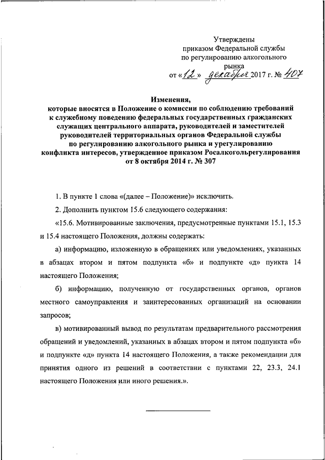 "О ВНЕСЕНИИ ИЗМЕНЕНИЙ В ПОЛОЖЕНИЕ О КОМИССИИ ПО СОБЛЮДЕНИЮ ТРЕБОВАНИЙ К СЛУЖЕБНОМУ ПОВЕДЕНИЮ ФЕДЕРАЛЬНЫХ ГОСУДАРСТВЕННЫХ ГРАЖДАНСКИХ СЛУЖАЩИХ ЦЕНТРАЛЬНОГО АППАРАТА, РУКОВОДИТЕЛЕЙ И ЗАМЕСТИТЕЛЕЙ РУКОВОДИТЕЛЕЙ ТЕРРИТОРИАЛЬНЫХ ОРГАНОВ ФЕДЕРАЛЬНОЙ СЛУЖБЫ ПО РЕГУЛИРОВАНИЮ АЛКОГОЛЬНОГО РЫНКА И УРЕГУЛИРОВАНИЮ КОНФЛИКТА ИНТЕРЕСОВ, УТВЕРЖДЕННОЕ ПРИКАЗОМ РОСАЛКОГОЛЬРЕГУЛИРОВАНИЯ ОТ 8 ОКТЯБРЯ 2014 Г. N 307"